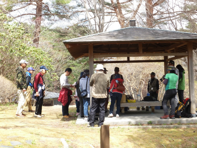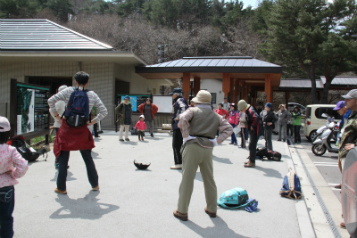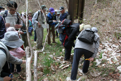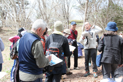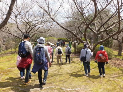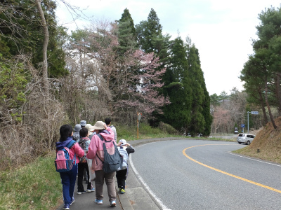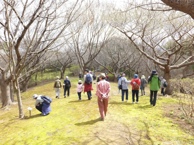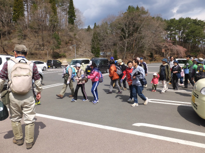 はじまりの会とストレッチをして、大人から子供まで22名の参加者の皆さんと、春の花を観察しに臼木山へ向かいます。