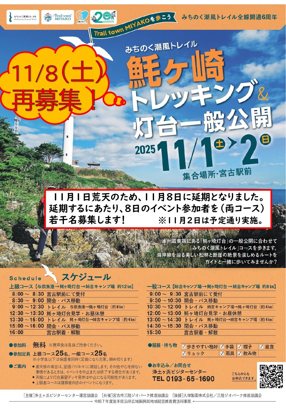 11月1日(土)に開催予定だった「みちのく潮風トレイル魹ヶ崎トレッキング&灯台一般公開」は、荒天の為11月8日(土)に延期することとなりました。 それに伴い、11月8日イベント参加者を若干名募集します。皆様のご参加お待ちしております! なお、11月1日の灯台内部の一般公開も中止となり、11月8日に延期になります。