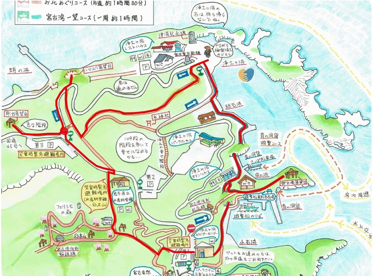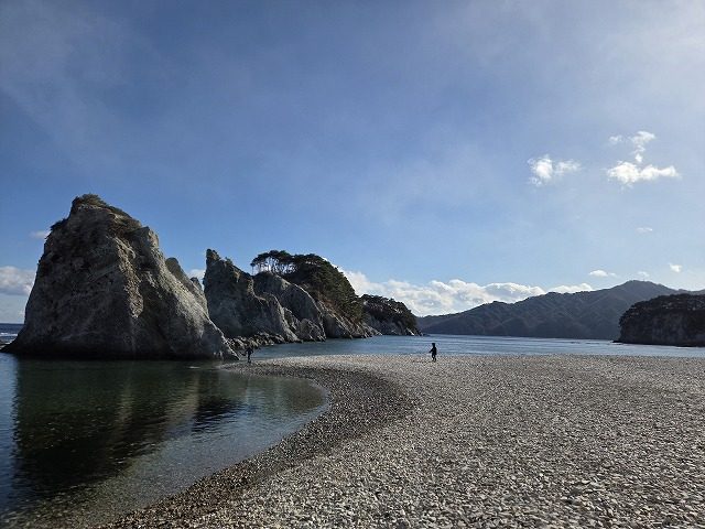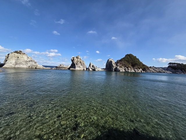 少し雲がかかり見ることができませんでしたが、太陽に照らされていると、海の色はキレイな”浄土ヶ浜エターナルグリーン”が見えます。