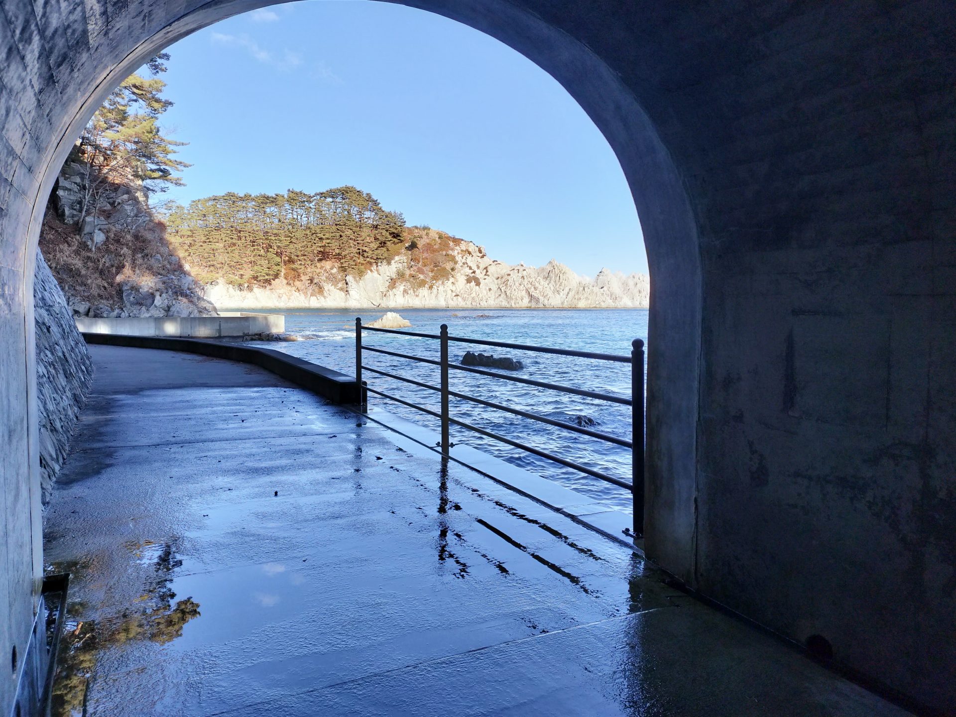 ※散策時の注意点※ ↑途中、海岸歩道が濡れている場合は波がかぶっている場所です。近寄らないように気を付けましょう!( トンネルの出入口付近は特に波がかぶりやすいので注意!)