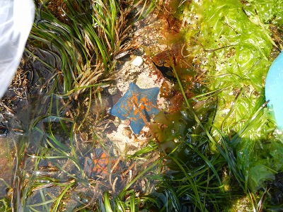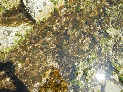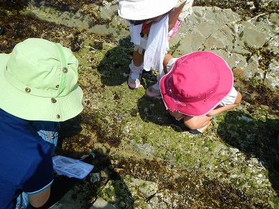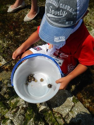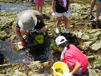 潮が引いて、タイドプールができた磯場では、カニ、ヤドカリ、ウニ、アワビ、カジカ、ヒトデ、ヒザラガイなど、たくさんの磯の生物を観察することができました。講師の佐々木先生から、「震災前に比べ今回の観察会では、コンブやアオサなどの海藻が元気にたくさん育っていて、海が再生している様子が見られますね。」というお話があり、震災から約3年たった海の様子が、少しずつ変化していて、自然の再生する力はすごい!と感動しました。また、パークボランティアさんからは、「今年はアメフラシやウミウシをみかけないなぁ」と、震災前に水産科学館さんが実施していた磯の観察会の時と比較したお話も聞くことができました。確かに、同じ場所で春によく見かけていたウミウシも、この日はどこかに隠れていた様子。もしかしたら、暑くて海藻の木陰に隠れていたのかもしれませんね。