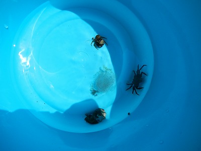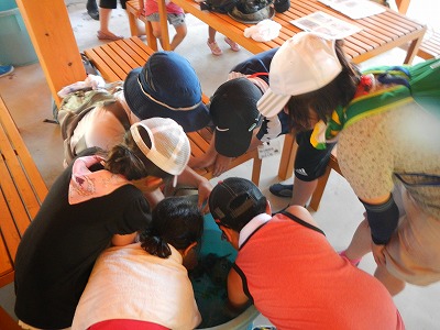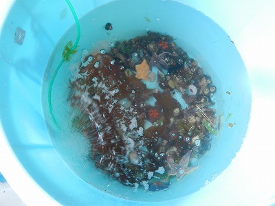 (磯場で見つけた生き物をエアレーションを入れた樽の中で観察します。)
