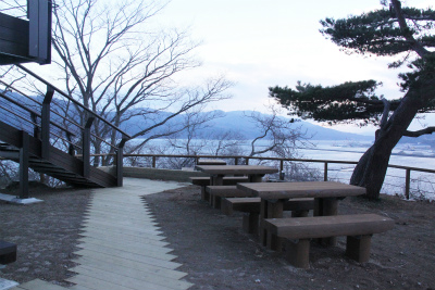 急な坂を少し登ると、「竜神崎展望所」に到着。階段やテーブルとベンチが、きれいに整備されていました。ここからの眺めは最高です♪これからの季節は、竜神崎展望所で、野鳥観察もいいかもしれません。