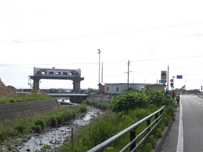 三鉄を模ったモニュメントの前を通る予定でしたが、工事中の為迂回します。