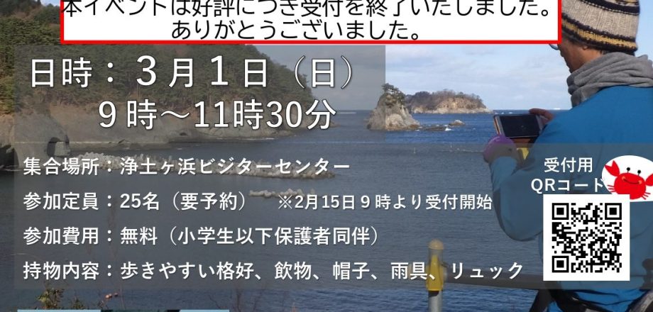 3/1(日)開催の「みちのく潮風トレイルin宮古毛ガニまつり」は定員に達した為、受付を終了いたします。 たくさんのご応募ありがとうございました。