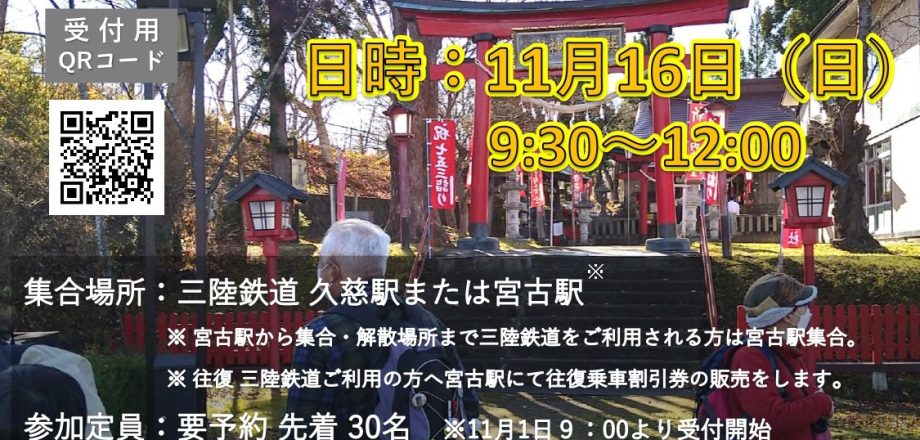去る10月11日(土)、三陸鉄道㈱との共催企画【トレイン&トレイルin野田村】を実施。三陸ジオパーク認定ガイド、赤坂広太さん(体験村たのはたネットワーク・北山崎ビジターセンター所属)のガイドのもと、野...