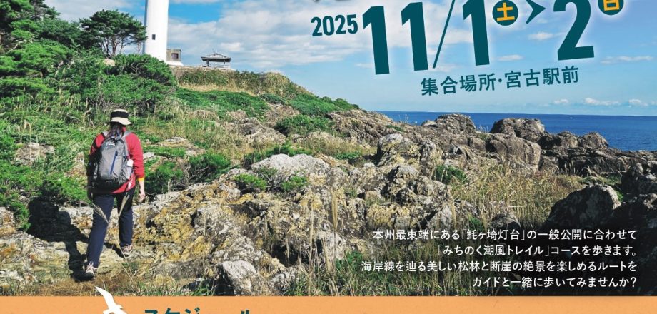 11月1日(土)、2日(日)の2日間「みちのく潮風トレイル 魹ヶ埼トレッキング&灯台一般公開」を開催します。 一般コースは姉吉キャンプ場から約8㎞、上級者コースは与奈漁港から灯台を経由し姉吉キャンプ場...